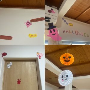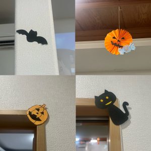 利用者の皆さんにも、手伝ってもらいカボチャやコウモリ、お化けなどを作りました!