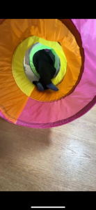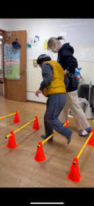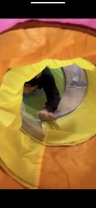 トンネルくぐりやトランポリン、ハードルを準備し室内を回っております。