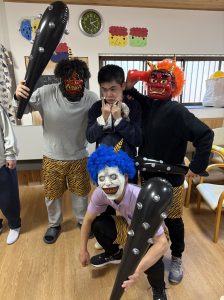 利用者様は少しびっくりした様子でしたが、豆にみたてた紙を丸めた鬼に投げ鬼退治をすることができました!