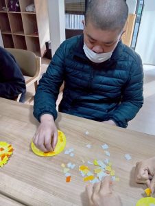 丸く切った黄色の画用紙にちぎった折り紙をペタペタ。。。
